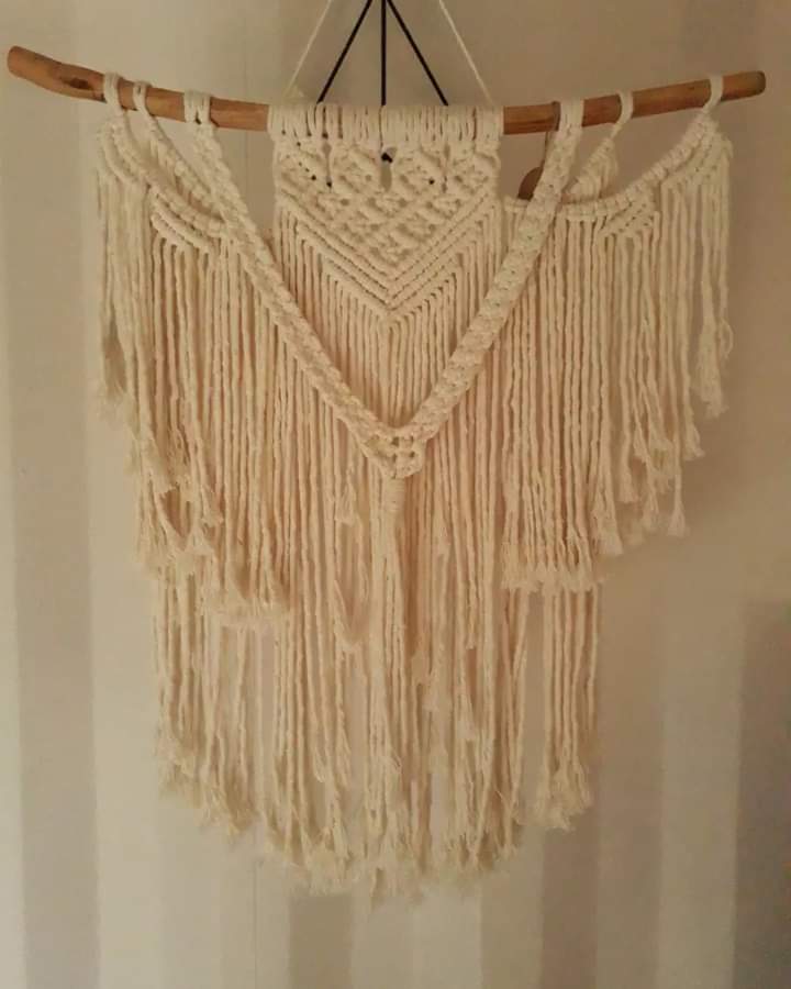 Painel em macramê, medindo 55cm por 65cm de altura, feito com cordão de algodão cru. A base é em galho de eucalipto, envernizado.